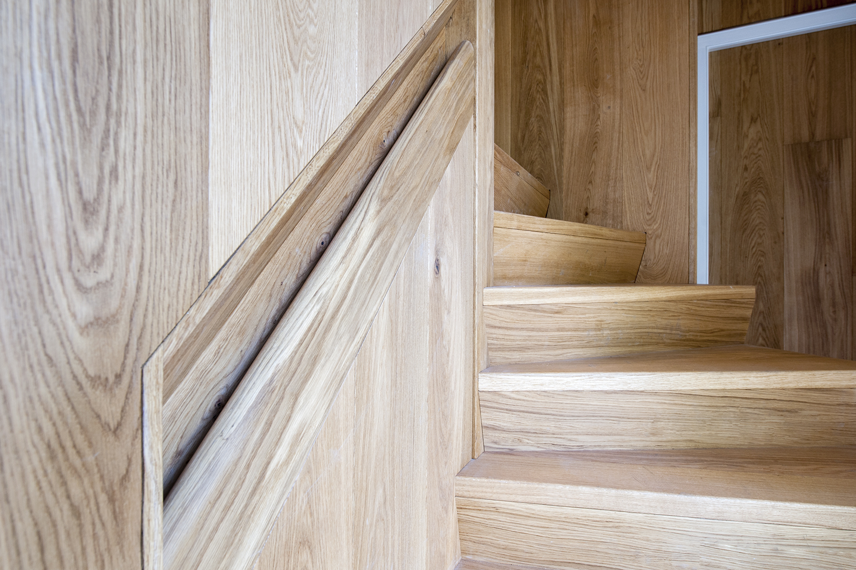Bastiaan benadrukt dat bij Duijnwijck eerst dendrochronologisch onderzoek is verricht op het bestaande houtwerk. De nieuwe eiken trap en de ingelaten eiken leuning is maatwerk en het hout is afgewerkt met WOCA natural oil. De bestaande paneeldeuren in eiken en grenen zijn opgeknapt en met vernis behandeld. De nieuwe wanden op de eerste verdieping in de zichtas onder de kap zijn uitgevoerd in eiken lamelparket. Dit loopt bijna naadloos door over de deur die nagenoeg onzichtbaar is. Ook het hang- en sluitwerk is verhuld. Het maatwerk in hout is op een meesterlijke wijze uitgevoerd door de timmerman Ad Scheel van Bouwbedrijf van den Engel.