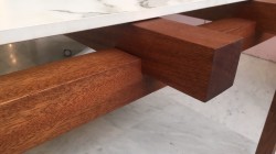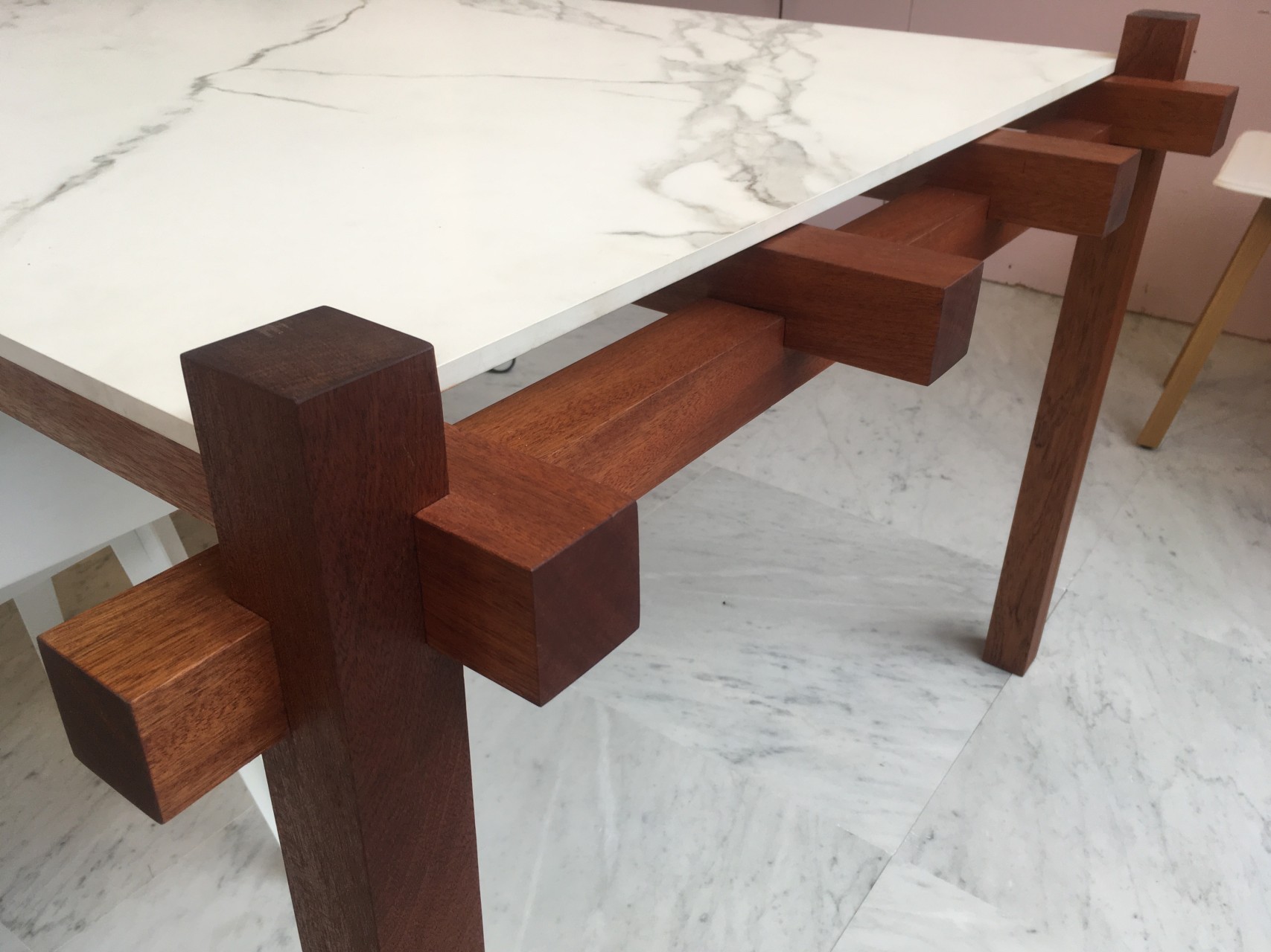 Het Sipo Mahonie voor deze ingenieuze houten draagstructuur onder een tafel met een 'flinterdun' tafelblad is gezaagd uit een enorme dikke Mahonie stam. Het hout is afgewerkt met olie. Het tafelblad is gemaakt van Neolith en deze hoogwaardig keramische plaat is slechts 12 mm dik.