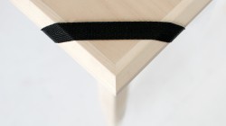 Het massief esdoorn hout in de stoel en tafel is afgewerkt met skylt lak, een supermatte lak. Voor het fixeren van het tafelblad in esdoorm multiplex is tassenband gekozen. De vlechttechniek in de tafel geeft de vrijheid om het blad -onafhankelijk van het onderstel- te vervangen of om te draaien.