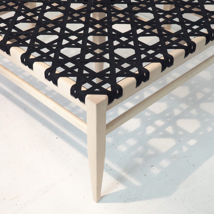De singelbandtechniek heeft ontwerper Bart Stoffijn zichtbaar verwerkt in zijn hoekbank met bijpassende tafel. Het zitmeubel is ontworpen voor in een wachtruimte, waar deze om een pilaar heen staat. De vorm van de bank laat de gebruiker kiezen om sociaal of ietwat afgezonderd te wachten. ‘De opvallend schuin aflopende leuning zorgt ervoor dat je een bepaalde distantie ervaart wanneer iemand naast je zit. Door de hoekvorm van de bank heb ik de zesslag weeftechniek iets moeten aanpassen wat een ietwat ander patroon opleverde.’